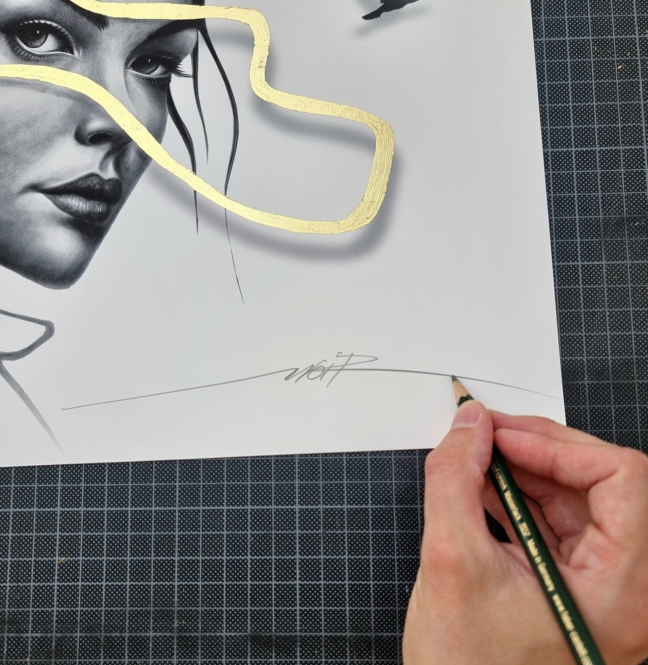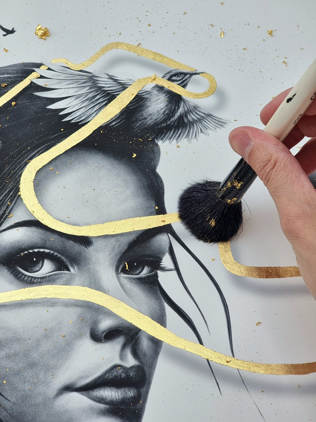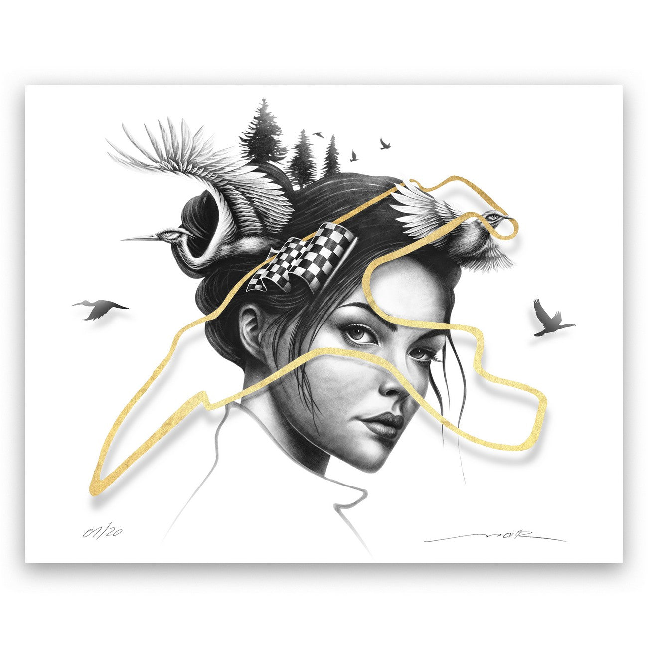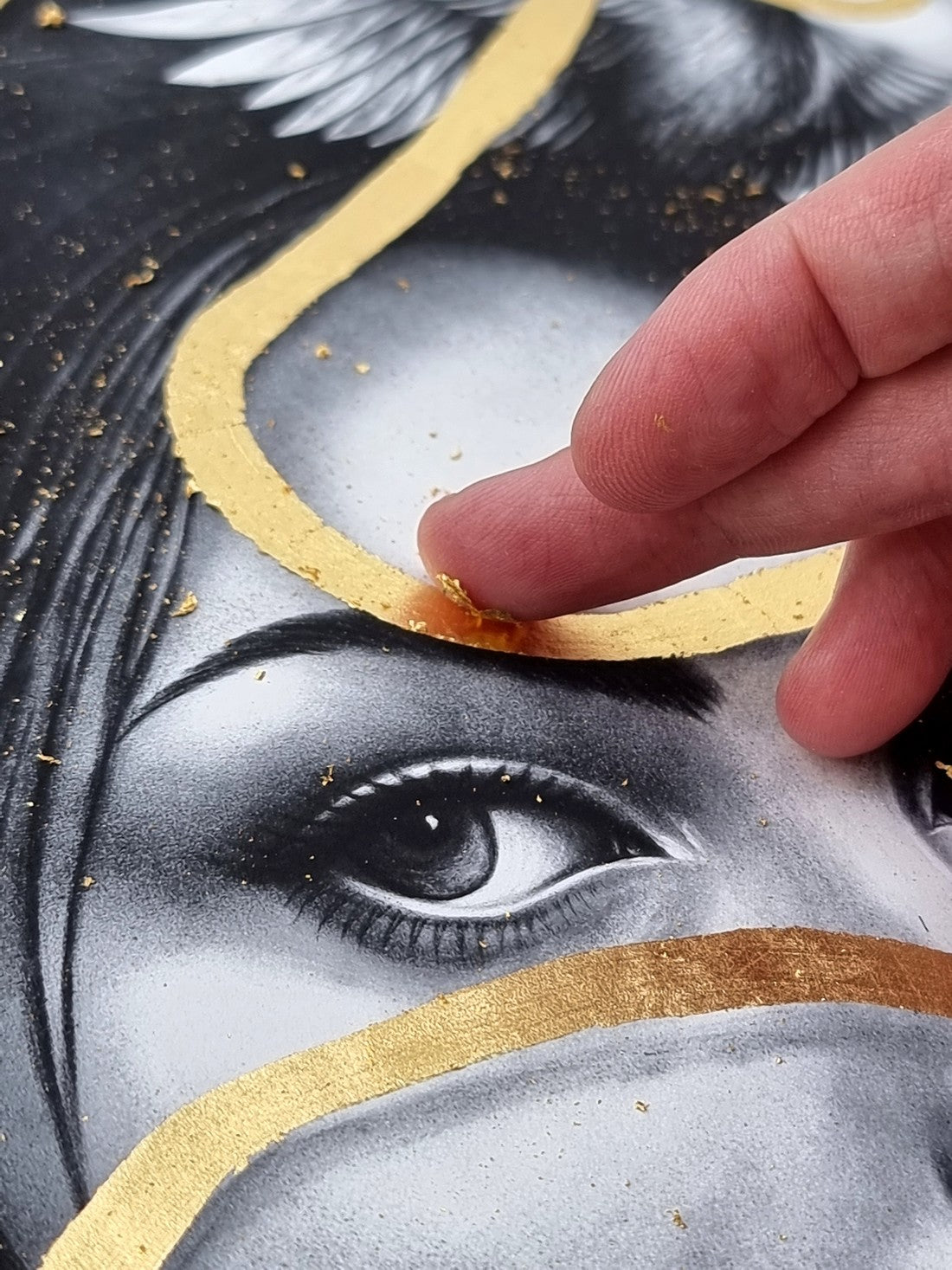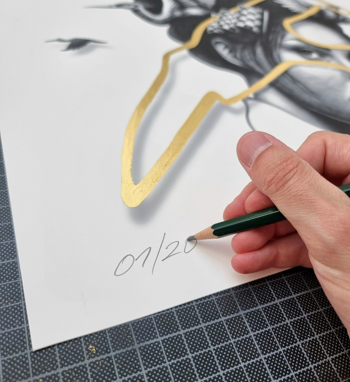 Chaque exemplaire est imprimé sur un papier d’art texturé, puis rehaussé à la feuille d'or 24kt dans notre atelier, rendant chaque pièce unique.