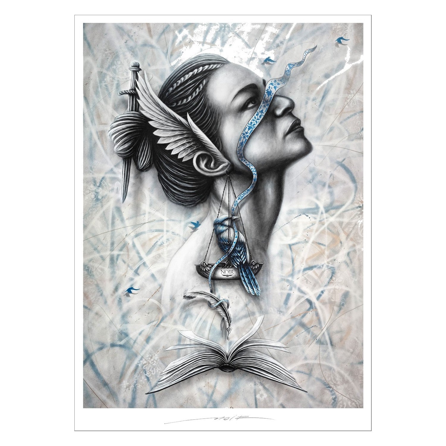 Symbole intemporel de Justice et d’équité, Thémis apparaît ici avec sa balance et son épée, délicatement dissimulée dans sa chevelure. Un livre ouvert et sa plume dégagent peu à peu le bandeau de ses yeux, révélant une quête de clarté et de savoir. La présence d’un geai bleu, messager de protection, apporte une touche de légèreté et d’espoir.